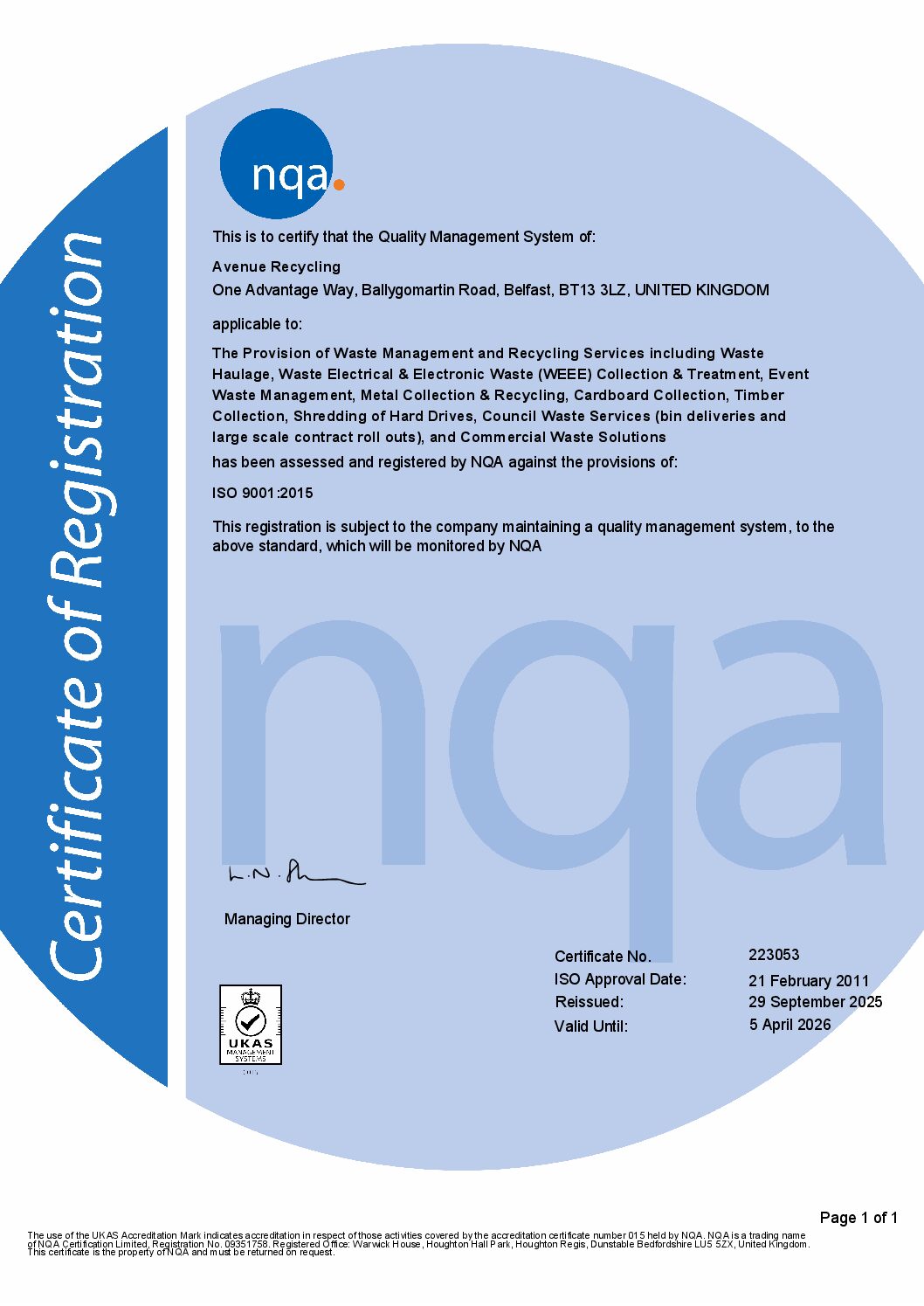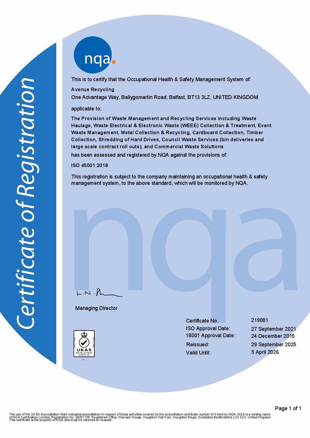 Avenue Recycling Limited are a Registered Waste Carrier with the NIEA, certified to ISO 14001, 9001 and 45001 Management Systems.